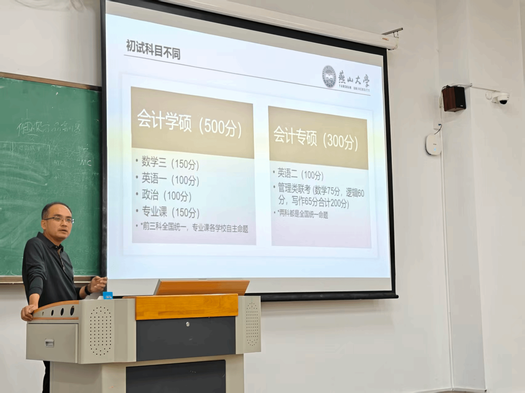 面对2023级大三学生在“考研深造还是职场就业”中的抉择困惑,会计系构建“学业诊断+专题赋能”双轨指导模式。学业导师通过座谈了解学生学习状况,针对课程难点、考研准备节奏、实习安排等问题提供定制化建议;10月12日,王玉坤老师在西五B201教室主讲考研专题讲座,结合近五年会计学专业考研数据,详解院校选择、专业选择、复习规划等关键环节,并重点分析本校研究生招生政策与优势学科方向,现场解答学生关于跨专业考研、专业课复习资料选择等疑问。
