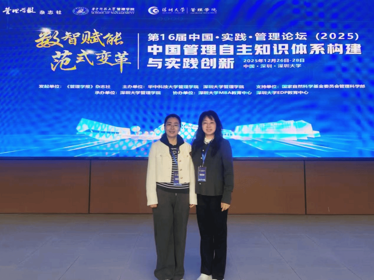 2025年12月26日至28日,备受学界与业界瞩目的第十六届中国·实践·管理论坛在深圳大学隆重举行并取得圆满成功。本届论坛由《管理学报》杂志社发起,华中科技大学管理学院与深圳大学管理学院共同主办,深圳大学管理学院承办,深圳大学MBA教育中心、EDP教育中心协办,并得到了国家自然科学基金委员会管理科学部的大力支持。我院教师张春玲、陈红梅受邀参加本次论坛。