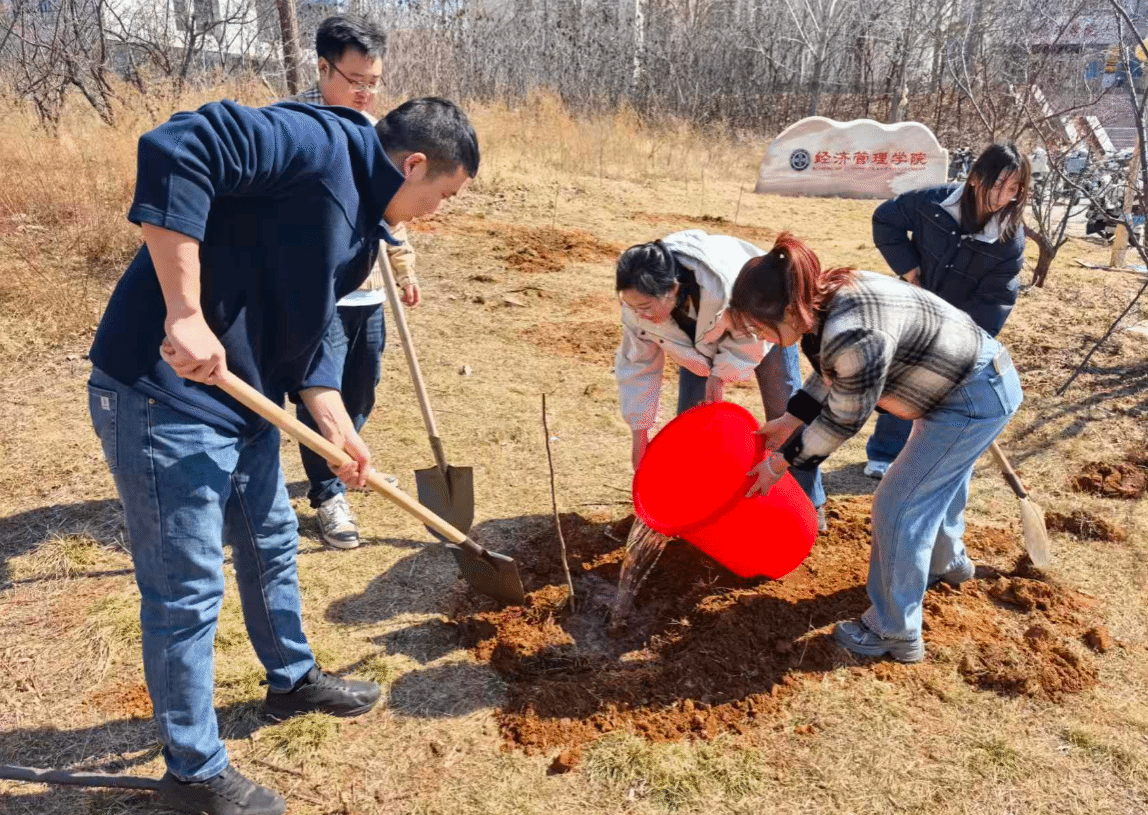活动现场,同学们分工协作、默契配合,挥锹铲土、扶苗定植、填土压实、浇水涵养,每一个环节都认真细致,现场氛围热烈而温馨。经过共同劳作,一棵棵山楂树苗稳稳扎根沃土,迎着春风挺立,成为学院门前一道亮眼的新景。