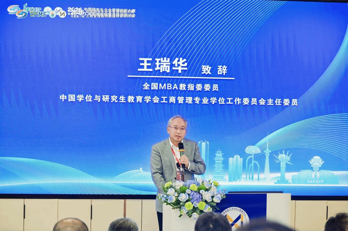 全国MBA教指委委员、中国学位与研究生教育学会工商管理专业学位工作委员会主任委员王瑞华致辞,他充分肯定大赛在案例开发、实践育人中的引领作用,高度认可案例教学的核心价值,希望以本次研讨为纽带,强化校际协同、深化教学创新,为参会教师搭建交流互鉴、资源共享、能力提升的高水平专业平台。