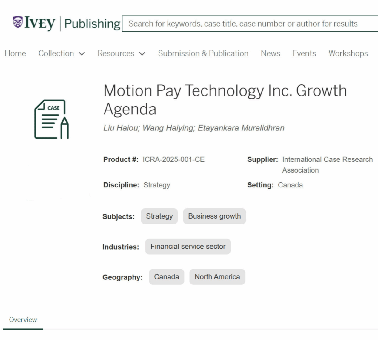 近日,我院刘海鸥教授团队开发的教学案例《Motion Pay Technology Inc. Growth Agenda》被国际顶尖案例机构——毅伟案例库(Ivey Publishing)收录。这是我院第二篇被海外知名案例库...