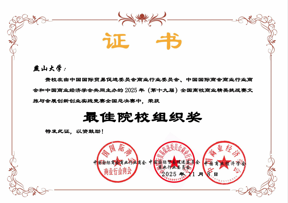近日,第十九届全国高校商业精英挑战赛文旅与会展创新创业实践竞赛全国总决赛圆满落下帷幕,我院13支团队进入全国总决赛并获得一等奖2项,二等奖6项,三等奖5项,学校获得“最佳院校组织奖”。此次为我院首次组队参加,获奖率达到100%。
